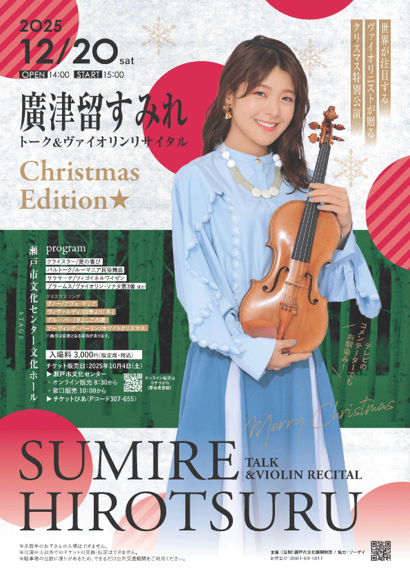 25年12月20日(土)廣津留すみれトーク&ヴァイオリンリサイタル Christmas Edition★(瀬戸市文化センター)