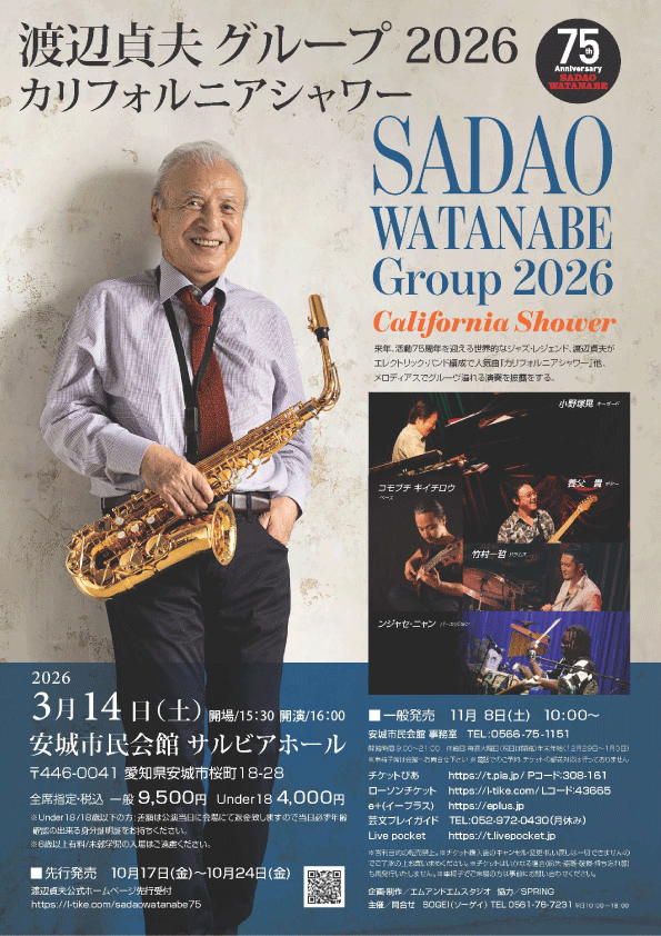 26年3月14(土) 渡辺貞夫グループ 2026 カリフォルニアシャワー (安城市民会館サルビアホール)